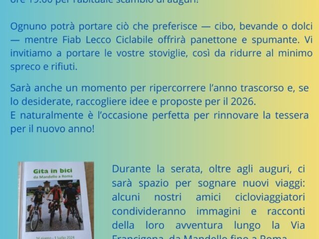 Serata conviviale per lo scambio di auguuri.  Apertura del tesseramento 2026. Proiezione di cicloviaggio "Da Mandello del Lario a Roma in bicicletta" Quando 16/12/2025 20:00 Dove Dopolavoro Ferroviario di Lecco - Stazione FS binario 1, primo piano Per partecipare Se si desidera partecipare al buffet si è invitati a collaborare con un piatto salato o...