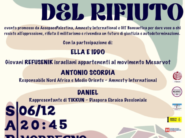 È con grande piacere che AssopacePalestinaValtellina, Amnesty International e il GIT di Banca Etica vi invitano ad un incontro con ELLA e IDDO, una ragazza ed un ragazzo israeliani refusenik, obiettori di coscienza che si rifiutano di servire nell'esercito israeliano. Saranno inoltre presenti DANIEL di Tikkun...