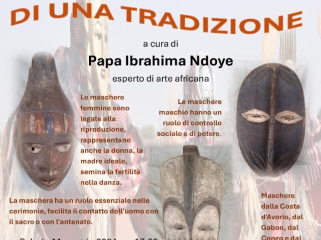 Esposizione e illustrazione di maschere provenienti dalla Costa d'Avorio, dal Gabon, dal Congo e dal Burkina Fasso