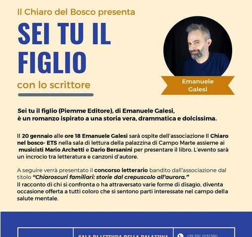 Il 20 gennaio 2024 alle ore 18 Emanuele Galesi sarà ospite dell’associazione Il Chiaro nel bosco- ETS nella sala di lettura della palazzina di Campo Marte assieme ai musicisti Mario Archetti e Dario Bersanini per presentare il libro 'Sei tu il figlio'.