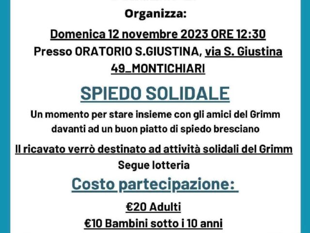 Grimm Cantieri di Solidarietà organizza, domenica 12 novembre 2023 ore 12:30, uno Spiedo Solidale (in presenza e da asporto) per sostenere i progetti e le attività solidali dell'Associazione. Lo spiedo si terrà presso l' Oratorio S. Giustina, Via S. Giustina, 49 a Montichiari (Bs).