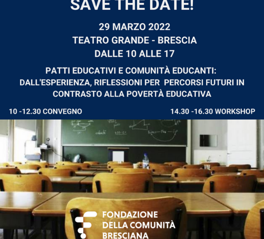 Fondazione della Comunità Bresciana organizza l’incontro dal titolo "Patti educativi e comunità educanti: dall’esperienza, riflessioni per percorsi futuri in contrasto alla povertà educativa" che si terrà al Teatro Grande di Brescia il 29 marzo 2022.