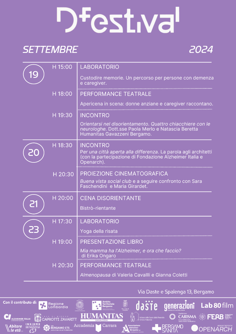 Dal 19 al 23 settembre a Daste si terrà la quarta edizione del Dfestival, un’importante occasione di welfare culturale, che propone modelli integrati di benessere degli individui e delle comunità, attraverso pratiche fondate sulle arti visive, performative e sul patrimonio culturale. Il festival utilizza i linguaggi artistici per introdurre e avvicinare le persone al mondo del disorientamento, scegliendo come data settembre, mese dedicato all’Alzheimer. Lo stigma da cui sono colpite le persone affette da demenza, rappresenta uno dei maggiori ostacoli che queste persone ed i loro familiari devono affrontare nel tentativo di vivere la loro vita con dignità, in contrasto ad una malattia che, nel tempo, distrugge la memoria, la storia, l’identità. Sperimentare lo stigma sulla propria pelle aumenta i sentimenti di isolamento sociale, depressione e abbandono. Il festival si declina in laboratori dedicati al disorientamento, presentazioni di libri, performance, spettacoli teatrali, proiezioni cinematografiche, incontri sulla Demetia Friendly Community e workshop dedicati alla trasformazione di spazi e luoghi per poter comprendere e accogliere al meglio il disorientamento in tutte le sue forme.