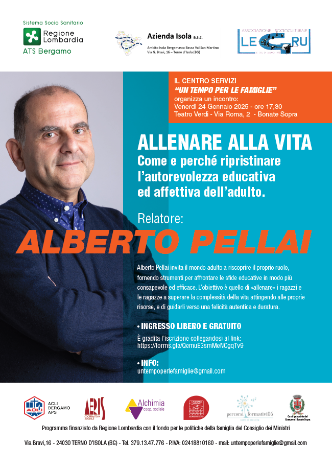 Il centro servizi Un Tempo per le Famiglie organizza venerdì 24 gennaio 2025 alle ore 17:30 presso il Teatro Verdi a Bonate Sopra l'incontro Allenare alla vita - Come e perché ripristinare l'autorevolezza educativa ed affettiva dell'adulto diretto da Alberto Pellai, pluripremiato medico, psicoterapeuta, ricercatore e scrittore, il quale affronterà il tema dell'allenamento dei giovani al superamento delle complessità della vita attingendo alle proprie risorse guidandoli verso una felicità autentica e duratura.