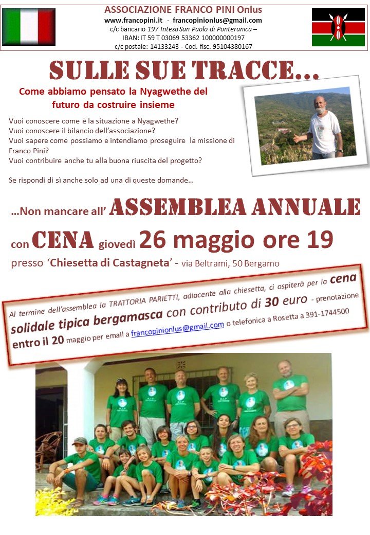 Giovedì 26 maggio, alle ore 19, alla Chiesetta di Castagneta, l'Associazione Franco Pini Onlus invita a partecipare all'assemblea annuale, un'occasione importante di nuovi incontri, testimonianza e relazioni. Dopo l'assemblea è in programma una cena conviviale e soldiale con piatti tipici della tradizione bergamasca presso la Trattoria Parietti, finalizzata a raccogliere fondi per le missioni in Kenya dell'Associazione.