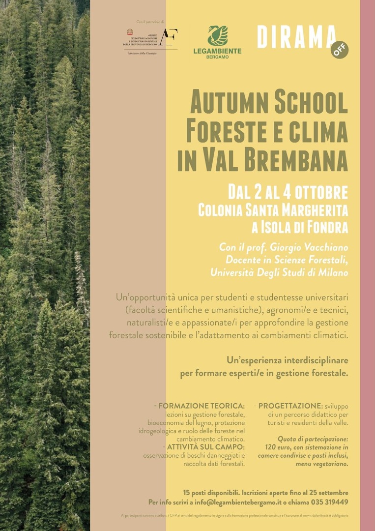 Il Circolo Legambiente Bergamo APS con il patrocinio dell'Ordine dei Dottori Agronomi e Dottori Forestali della Provincia di Bergamo presenta la prima Autumn School dedicata alla gestione forestale sostenibile e all'adattamento ai cambiamenti climatici.