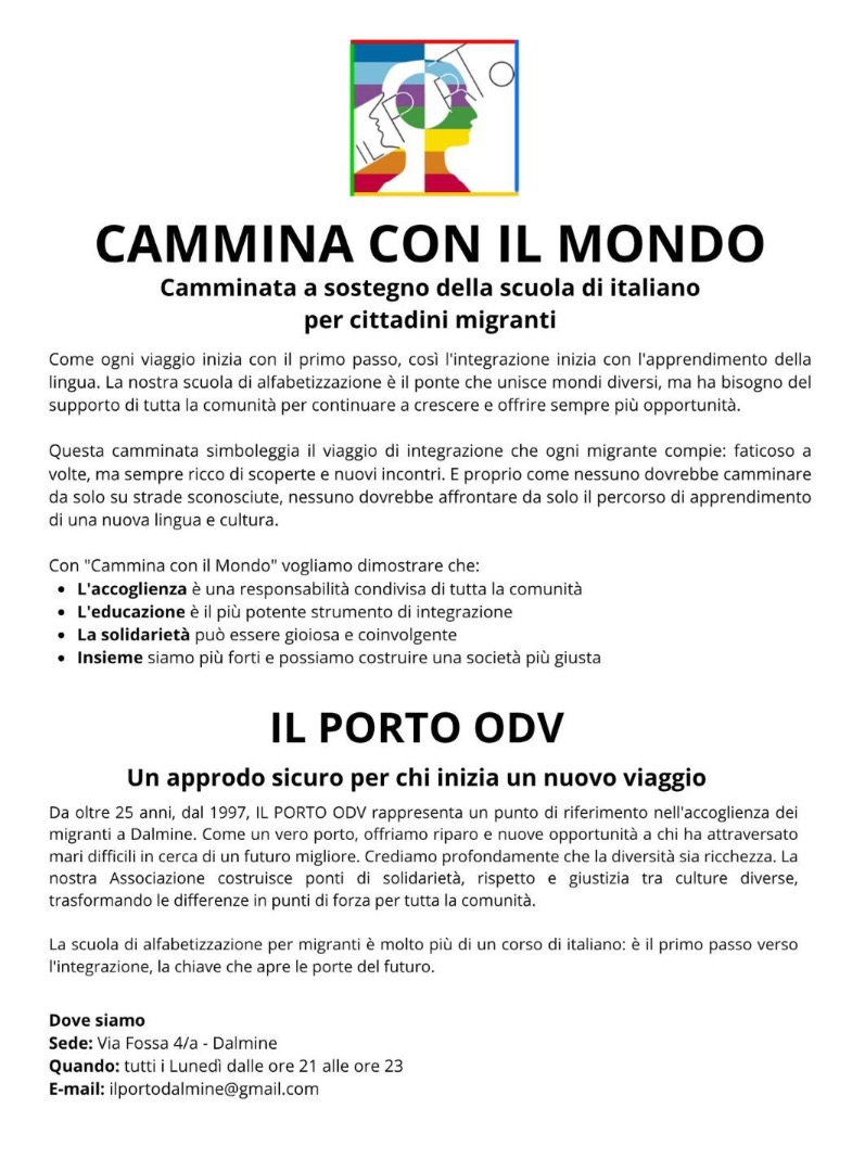 Da oltre 25 anni, dal 1997, IL PORTO ODV rappresenta un punto di riferimento nell'accoglienza dei migranti a Dalmine. Come un vero porto, offriamo riparo e nuove opportunità a chi ha attraversato mari difficili in cerca di un futuro migliore. Crediamo profondamente che la diversità sia ricchezza. L’associazione costruisce ponti di solidarietà, rispetto e giustizia tra culture diverse, trasformando le differenze in punti di forza per tutta la comunità. La scuola di alfabetizzazione per migranti è molto più di un corso di italiano: è il primo passo verso l'integrazione, la chiave che apre le porte del futuro.