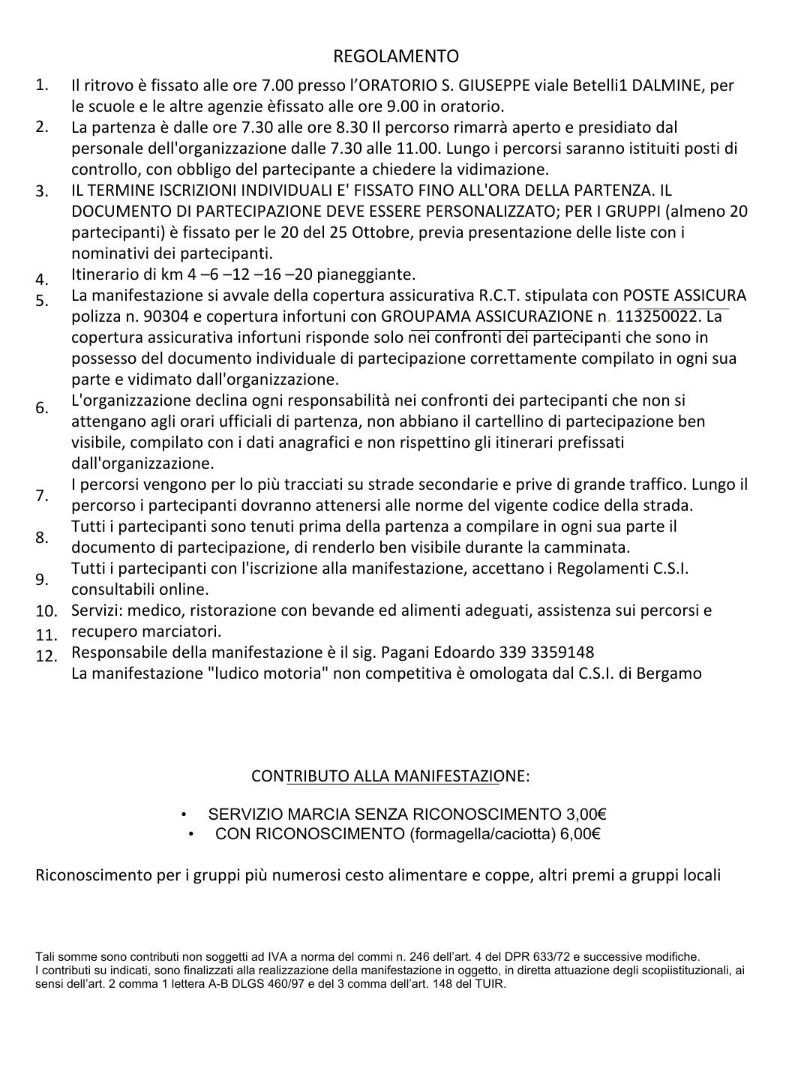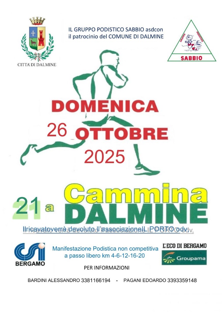 Domenica 26 ottobre è in programma la ventunesima «Cammina Dalmine» organizzata da alcune realtà del territorio e il cui ricavato andrà a sostegno della scuola di alfabetizzazione dell’associazione IL PORTO ODV. Il ritrovo è fissato alle 7 all’oratorio San Giuseppe, mentre per le scuole e le altre agenzie è fissato alle 9. Previsti diversi percorsi.