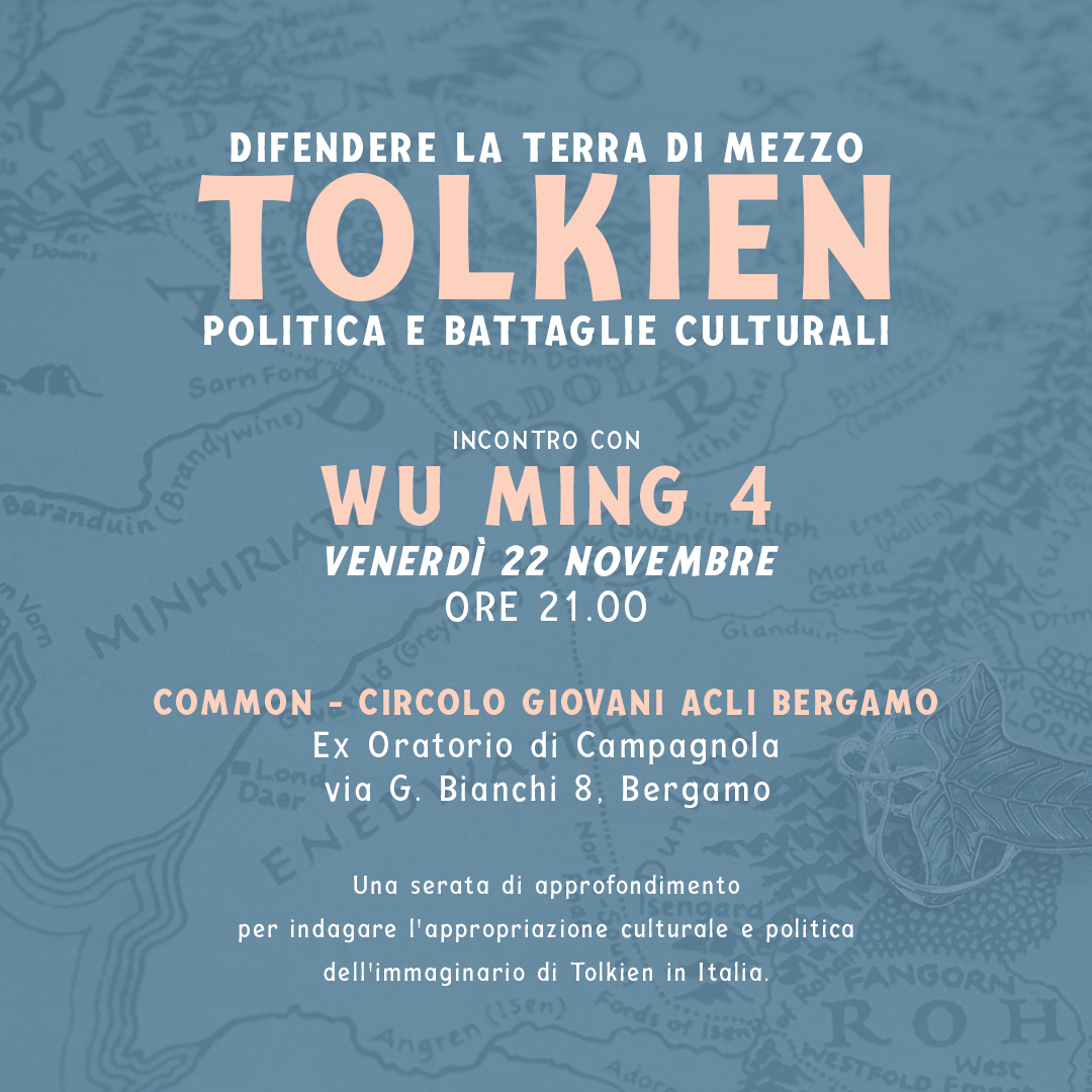 Common - Circolo Giovani di ACLI Bergamo assieme a Wu Ming 4 invita venerdì 22 novembre alle ore 21:00 all'incontro Difendere la terra di mezzo Tolkien - Politica e battaglie culturali una serata di approfondimento per indagare l'appropriazione culturale e politica dell'immaginario tolkieniano in Italia.