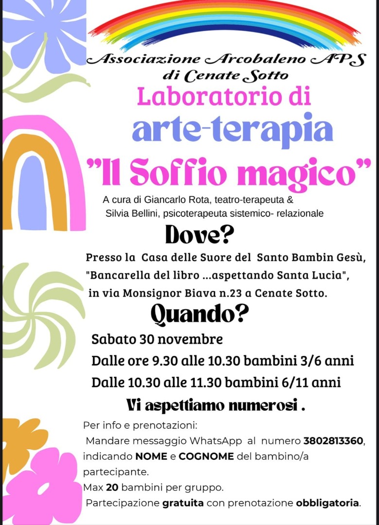 L'associazione Arcobaleno di Cenate Sotto APS presenta il laboratorio di arte-terapia Il Soffio Magico a cura di Giancarlo Rota, teatro-terapeuta e Silvia Bellini, psicoterapeuta sistemico-relazionale.