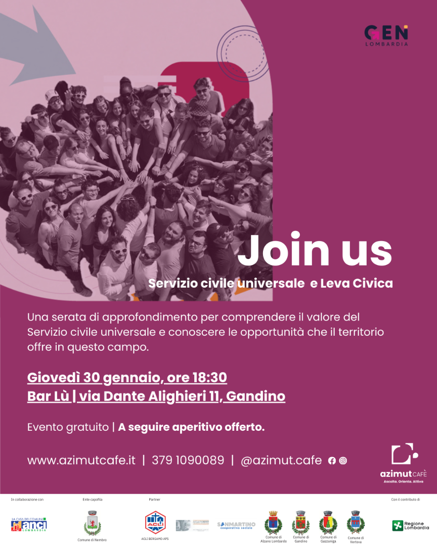 La serata è organizzata dal Comune di Nembro in collaborazione con ANCI, in partnership con ACLI Bergamo APS, ACLI Nembro, San Martino Cooperativa Sociale, i Comuni di Alzano Lombardo, Gandino, Gazzaniga e Vertova, con il contributo di Regione Lombardia e all'interno del progetto Azimut Cafè