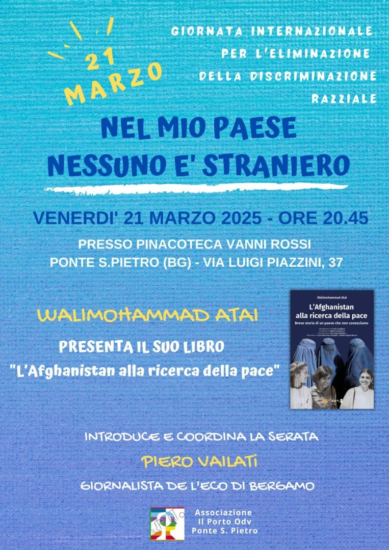 Il Porto ODV, in occasione della Giornata internazionale per l'eliminazione della discriminazione razziale, organizza venerdì 21 marzo alle ore 20:45 presso la pinacoteca Vanni Rossi di Ponte San Pietro l'incontro Nel mio paese nessuno è straniero.