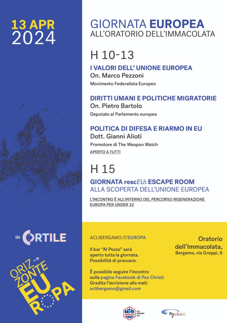 Il secondo appuntamento del percorso prevede due momenti nella giornata di sabato 13 aprile: dalle 10 alle 13 una mattinata di ascolto, pensiero e discussione su valori europei, diritti umani e pace e riarmo. Partecipano Marco Pezzoni del Movimento Federalista Europeo; Pietro Bartolo, deputato al Parlamento europeo e Gianni Alioti promotore di The Weapon Watch.
