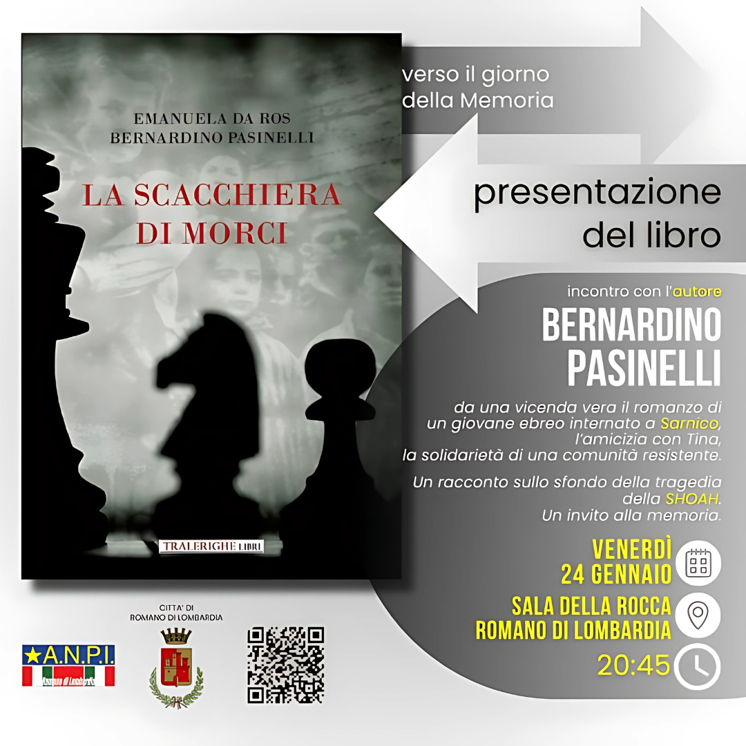 Associazione Nazionale Partigiani d'Italia - Sezione Romano di Lombardia, in avvicinamento al Giorno della Memoria, invita alla presentazione del libro La scacchiera di Morci di Emanuela Da Ros e Bernardino Pasinelli, l'incontro, al quale presenzierà anche uno degli autori, si terrà venerdì 24 gennaio 2025 alle 20:45 presso la Sala della Rocca di Romano di Lombardia.