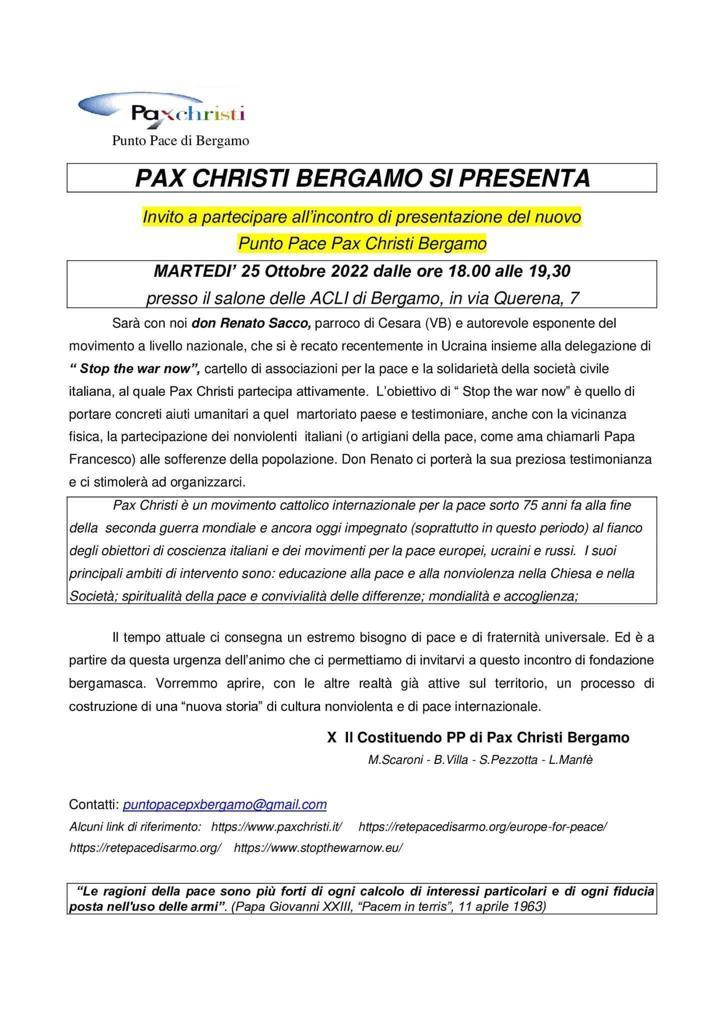 Martedì 25 ottobre 2022 dalle 18 alle 19.30 si svolge l'incontro di presentazione del nuovo punto pace Pax Christi di Bergamo, presso il salone delle Acli di Bergamo.