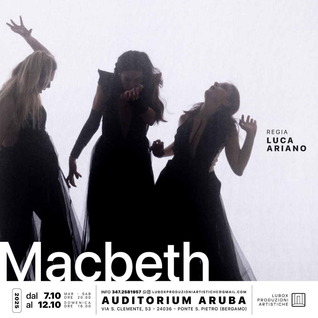 LUBOX prudozioni artistiche è lieto di invitarvi alla serata gratuita del nostro spettacolo teatrale “Macbeth”, che si terrà mercoledì 8 ottobre alle ore 20.00 presso il Centro Aruba di Bergamo.