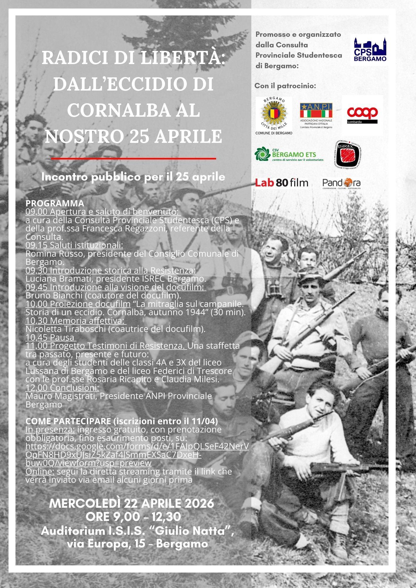 È un’iniziativa pensata dagli studenti per gli studenti quella in programma mercoledì 22 aprile alle 9 all’Auditorium dell’Isis Giulio Natta di Bergamo. Si intitola «Radici di libertà: dall’eccidio di Cornalba al 25 aprile» ed è promossa dalla Consulta provinciale studentesca di Bergamo con il patrocinio del Comune di Bergamo, Anpi-Comitato provinciale di Bergamo, Coop Lombardia, Isrec, Lab80film, Pandora e Centro di Servizio per il Volontariato. Un appuntamento che nasce dentro le scuole e dai percorsi già avviati sul territorio, con l’obiettivo di riportare al centro il significato del 25 aprile a partire dalle storie, dai luoghi e dalle esperienze vissute (anche) dagli stessi ragazzi. Al centro della mattinata ci sarà il racconto dell’eccidio di Cornalba, uno degli episodi più tragici della Resistenza bergamasca, attraverso la proiezione del docufilm «La mitraglia sul campanile», realizzato nel 2020 e presentato dal coautore Bruno Bianchi, ricercatore, volontario di Anpi Valle Brembana e tra i promotori del progetto «Testimoni di Resistenza».