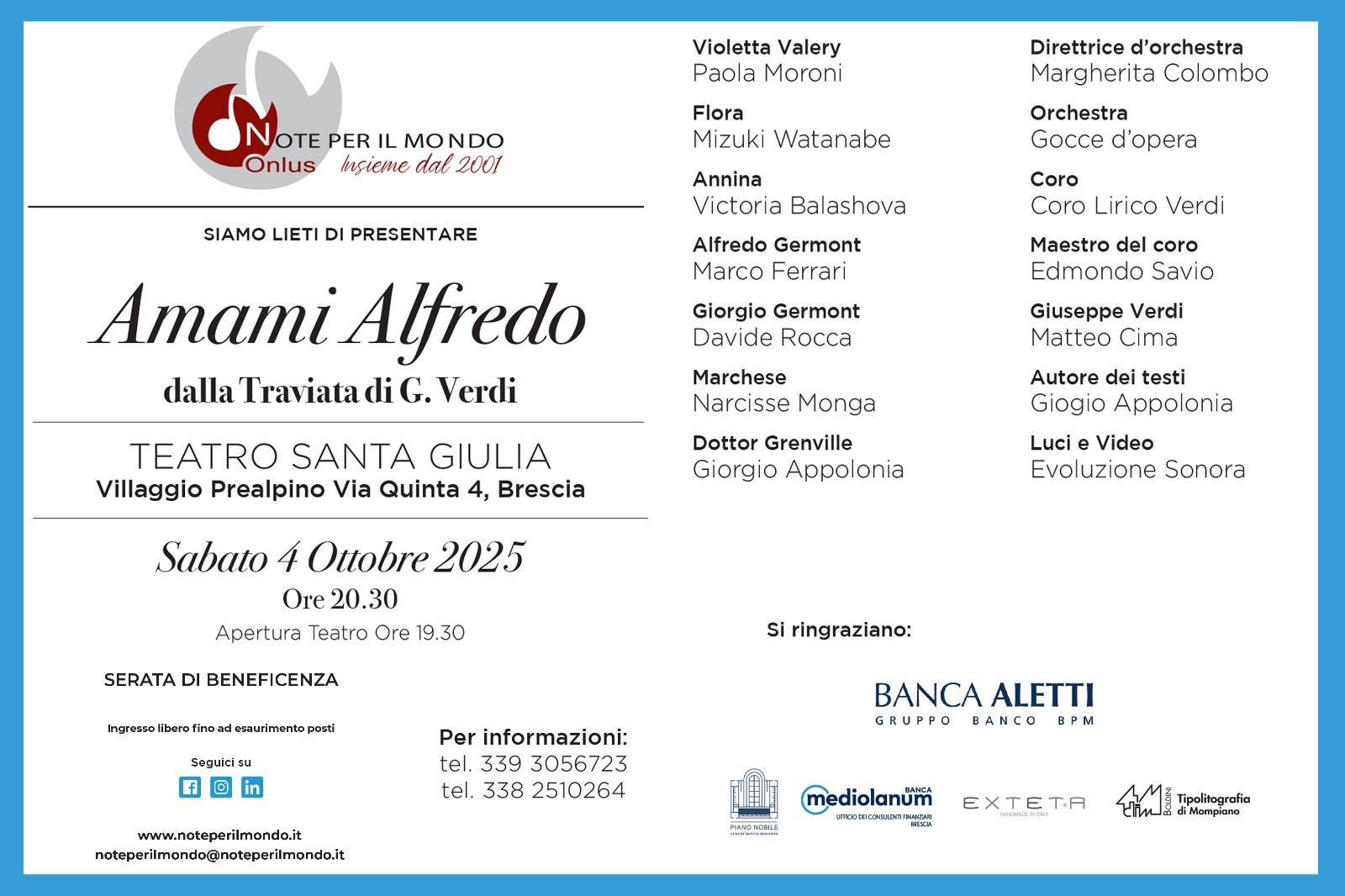 L'Associazione Note per il Mondo organizza l'evento “Amami, Alfredo” un concerto speciale dedicato a La Traviata di Giuseppe Verdi, con i suoi momenti più celebri e struggenti.