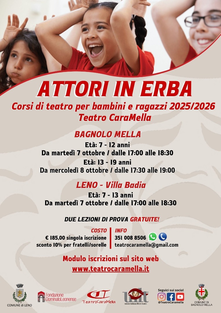 In attesa dell’inizio della nuova stagione teatrale, Teatro CaraMella è lieto di presentare l’edizione 2025/2026 di "Attori in erba", i suoi corsi di teatro dedicati ai più giovani.