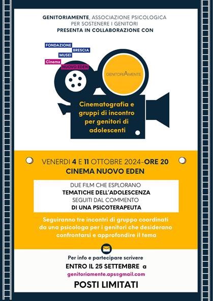 L'Associazione Genitoriamente in collaborazione con la Fondazione Brescia Musei organizza "Cinematografia e gruppi di incontro per genitori di adolescenti". Venerdì 4 e 11 ottobre 2024 alle ore 20:00 al Cinema Nuovo Eden saranno proiettati due film che esplorano tematiche dell'adolescenza seguiti da un commento di una psicoterapeuta.