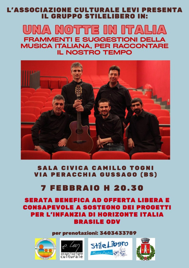 Horizonte Italia Brasile ODV in collaborazione con l'Associazione Culturale Levi e con il patrocinio del Comune di Gussago propongono: "Una notte in Italia. Frammenti e suggestioni della musica italiana, per raccontare il nostro tempo"