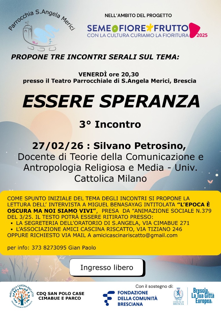 Venerdì 27 febbraio 2026 è in programma il terzo incontro del ciclo "Essere Speranza" organizzato dalla Parrocchia di S.Angela Merici nell'ambito del progetto "SEME-FIORE-FRUTTO. CON LA CULTURA CURIAMO LA FIORITURA 2025" di cui è capofila Amici della Cascina Riscatto Odv, ammesso al Bando Prossimità del Comune di Brescia in collaborazione con la Fondazione della Comunità Bresciana.