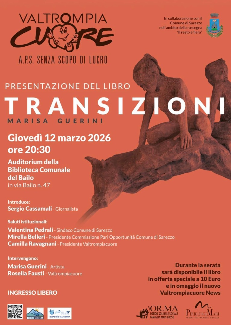 L'Associazione Valtrompiacuore APS in collaborazione con il Comune di Sarezzo invita la cittadinanza  giovedì 12 marzo 2026 alle ore 20:30 all' incontro di presentazione del libro "Transizioni"  di Marisa Guerini.
