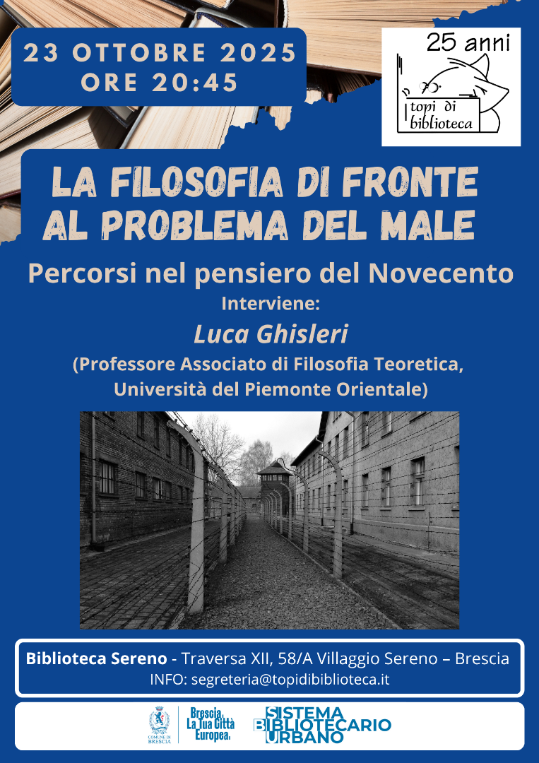 Giovedì 23 ottobre 2025 alle ore 20:45 presso la Biblioteca Sereno di Brescia, l’Associazione culturale “Topi di biblioteca” propone  l’incontro intitolato “La filosofia di fronte al problema del male. Percorsi nel pensiero del Novecento” – in cui interverrà Luca Ghisleri (professore di Filosofia teoretica presso l’Università del Piemonte Orientale).  Il relatore rifletterà sull’essenza del male e sulle domande esistenziali che l’uomo si pone davanti alla sua tragica presenza, anche considerando il contributo dei tre grandi pensatori Paul Ricoeur, Hans Jonas e Luigi Pareyson.
