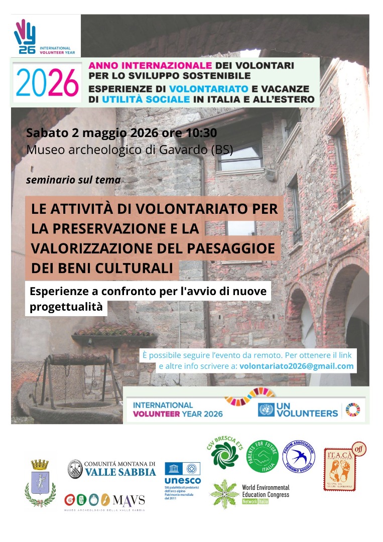 Nell'ambito dell'Anno internazionale dei volontari per lo sviluppo sostenibile proclamato dall'Assemblea Generale delle Nazioni Unite, il MAVS Museo Archeologico della Valle Sabbia è lieto di ospitare il seminario dal titolo "Le attività di volontariato per la preservazione del paesaggio e dei beni culturali. Esperienze a confronto per l'avvio di nuove progettualità".