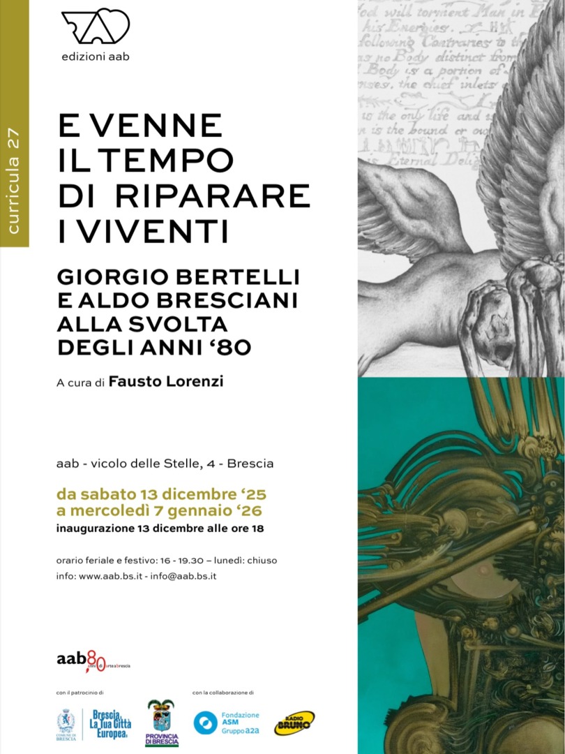 Prosegue fino al 7 gennaio 2026, presso la sede dell’ Associazione Artisti Bresciani in vicolo delle Stelle, 4 a Brescia, la mostra “E venne il tempo di riparare i viventi. Giorgio Bertelli e Aldo Bresciani alla svolta degli anni ‘80”.