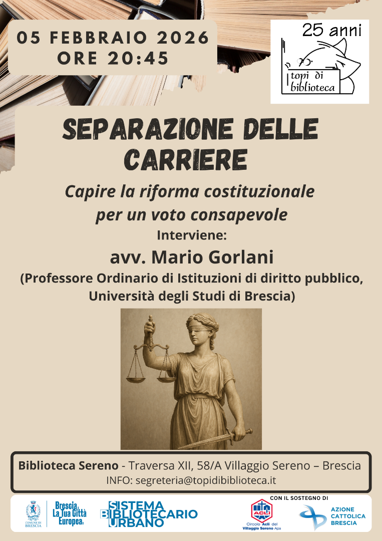 L’Associazione culturale “Topi di biblioteca ODV” promuove giovedì 5 febbraio 2026, ore 20:45, alla Biblioteca Sereno (Villaggio Sereno, Brescia), un incontro di approfondimento sulla separazione delle carriere nella magistratura e la riforma costituzionale della giustizia, dal titolo “Separazione delle carriere. Capire la riforma costituzionale per un voto consapevole”.