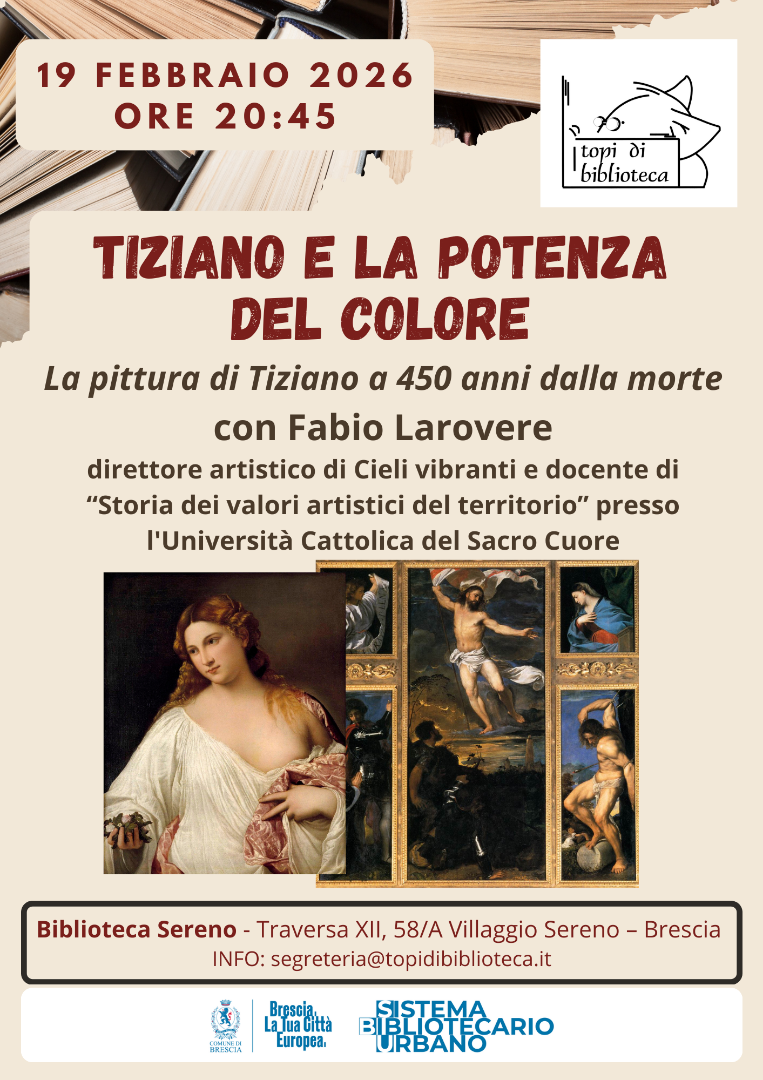 L’Associazione culturale “Topi di biblioteca ODV” promuove giovedì 19 febbraio 2026, ore 20:45, alla Biblioteca Sereno (Villaggio Sereno, Brescia), un incontro su ”Tiziano e la potenza del colore. La pittura di Tiziano a 450 anni dalla morte”. La serata sarà a cura di Fabio Larovere, direttore artistico di Cieli vibranti e docente di “Storia dei valori artistici del territorio” dell’Università Cattolica del Sacro Cuore.