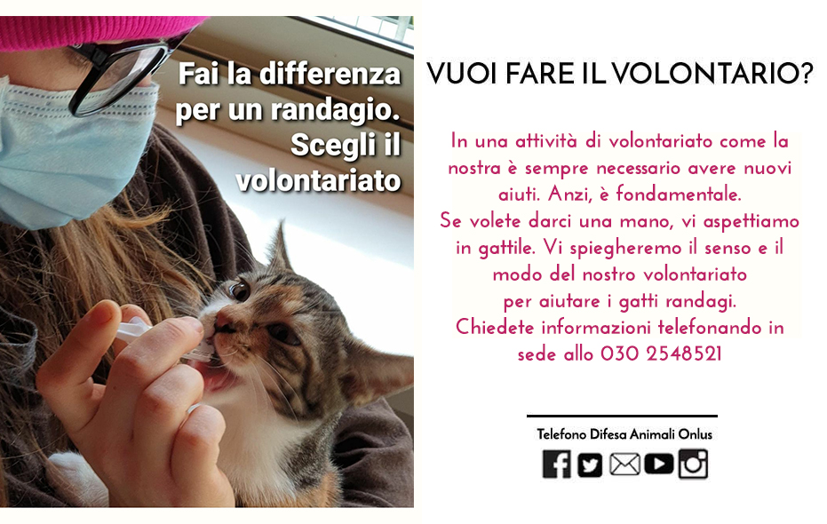 Telefono Difesa Animali di Capriano del Colle è alla ricerca di volontari che possano lavorare a contatto con gli ospiti felini, sia in sede che nelle colonie, o che possano gestire i gattini a balia o contribuire alla gestione operativa di social/raccolte fondi/gadget solidali.