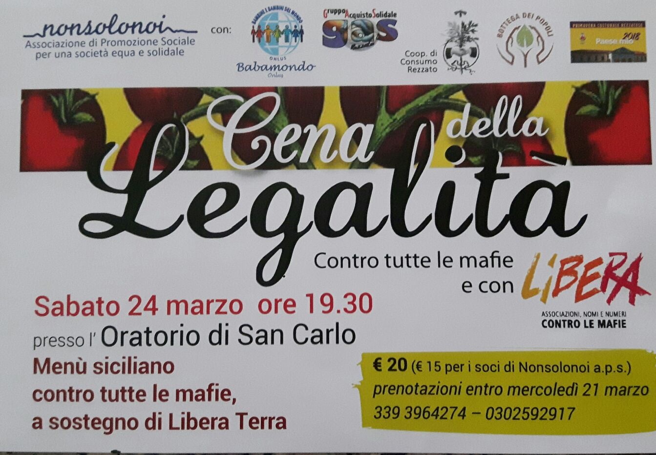 L’Associazione Non solo noi in collaborazione con Libera, Babamondo, Gas Rezzato, Bottega dei Popoli, Coop di consumo Rezzato e Paese Mio organizza la cena della legalità contro tutte le mafie.