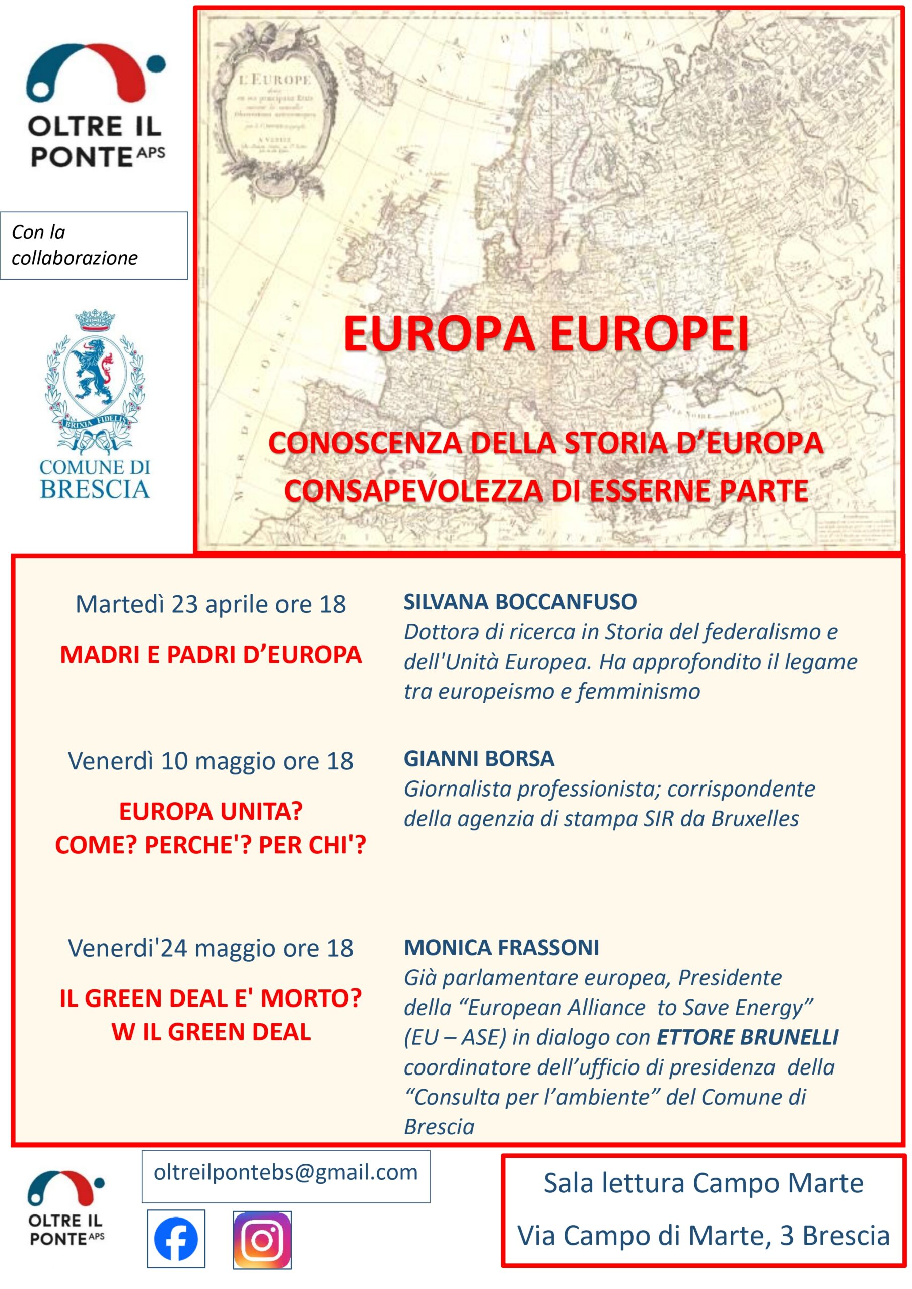 L’ iniziativa, dal titolo “L’Europa e gli europei – conoscenza della storia d’Europa, consapevolezza di esserne partner”, ha il patrocinio del Comune di Brescia e si articolerà in tre incontri con l’obiettivo di accompagnare i partecipanti alla conoscenza della storia e dell’attività dell’Unione Europea e alla consapevolezza di esserne parte.