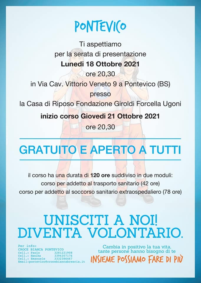 Per le iscrizioni o per aver maggiori informazioni contattare Croce Bianca sezione di Pontevico via e-mail a pontevico@crocebiancabrescia.it oppure telefonicamente i referenti;