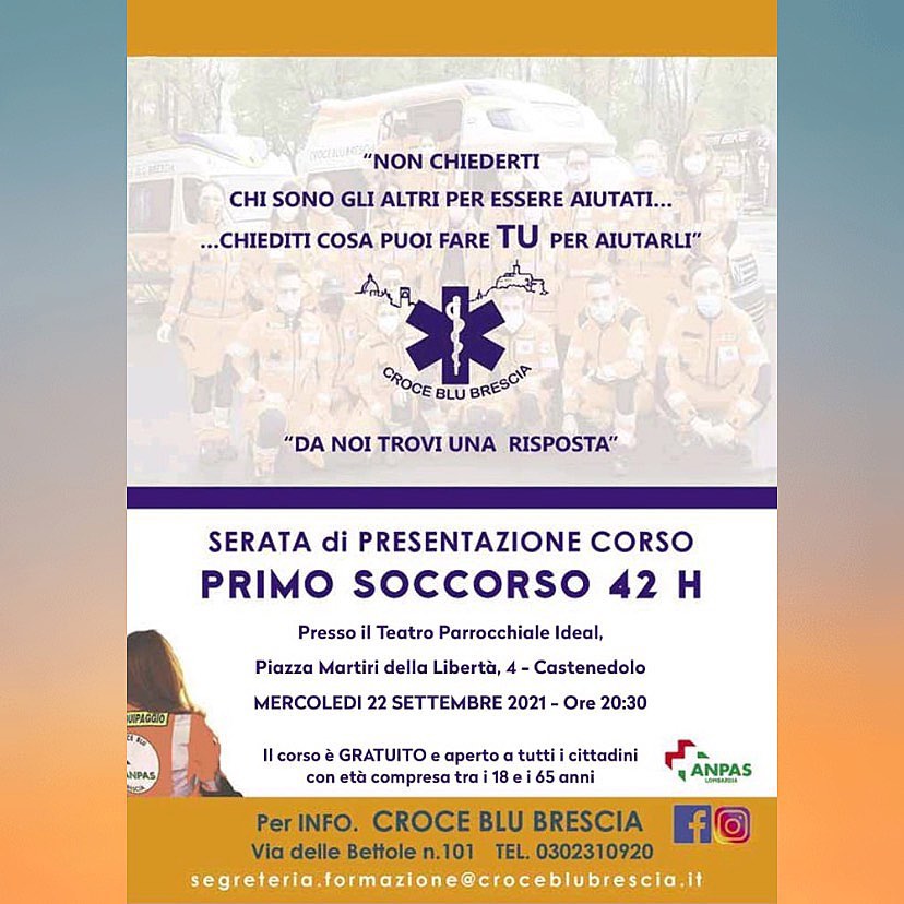 Mercoledì 22 settembre 2021 presso il Teatro Parrocchiale Ideal, Piazza Martiri della Libertà, 4 – Castenedolo, dalle 20:30 si terrà la presentazione dell’associazione ODV Croce Blu e del Corso per Addetto al trasporto sanitario. Il corso completamente gratuito e dalla durata complessiva di 42 ore, è rivolto a tutti i cittadini di età compresa tra i 18 e i 65 anni.