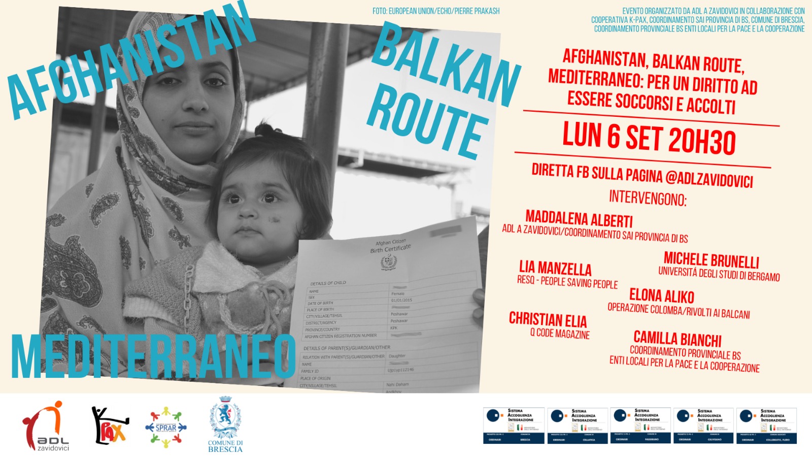 ADL a Zavidovici in collaborazione con Cooperativa K-Pax, il Coordinamento SAI Provincia di Brescia, il Comune di Brescia e il Coordinamento Provinciale bresciano degli Enti locali per la Pace e la Cooperazione – organizza per lunedì 6 settembre alle ore 20:30 un momento di riflessione online dedicato alle indicibili violazioni in corso non solo in Afghanistan, ma anche lungo la rotta balcanica e mediterranea.