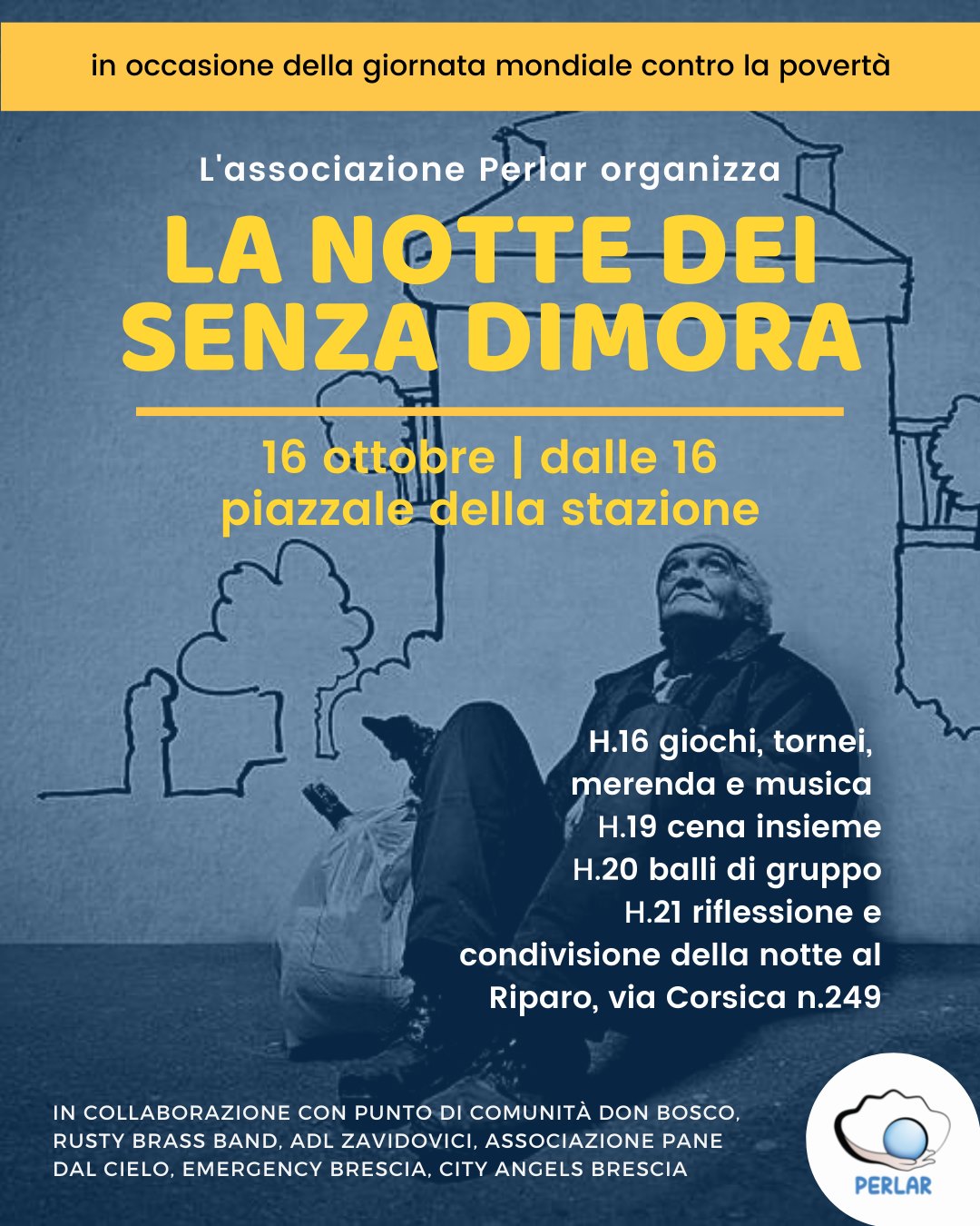 In occasione della Giornata Mondiale contro la Povertà (17 Ottobre), l’associazione PERLAR organizza “La Notte dei Senza Dimora” una giornata di attività sociali promosse dall’associazione che si svolgeranno il 16 Ottobre 2021 dalle ore 16:00 presso il Piazzale della Stazione FS di Brescia.
