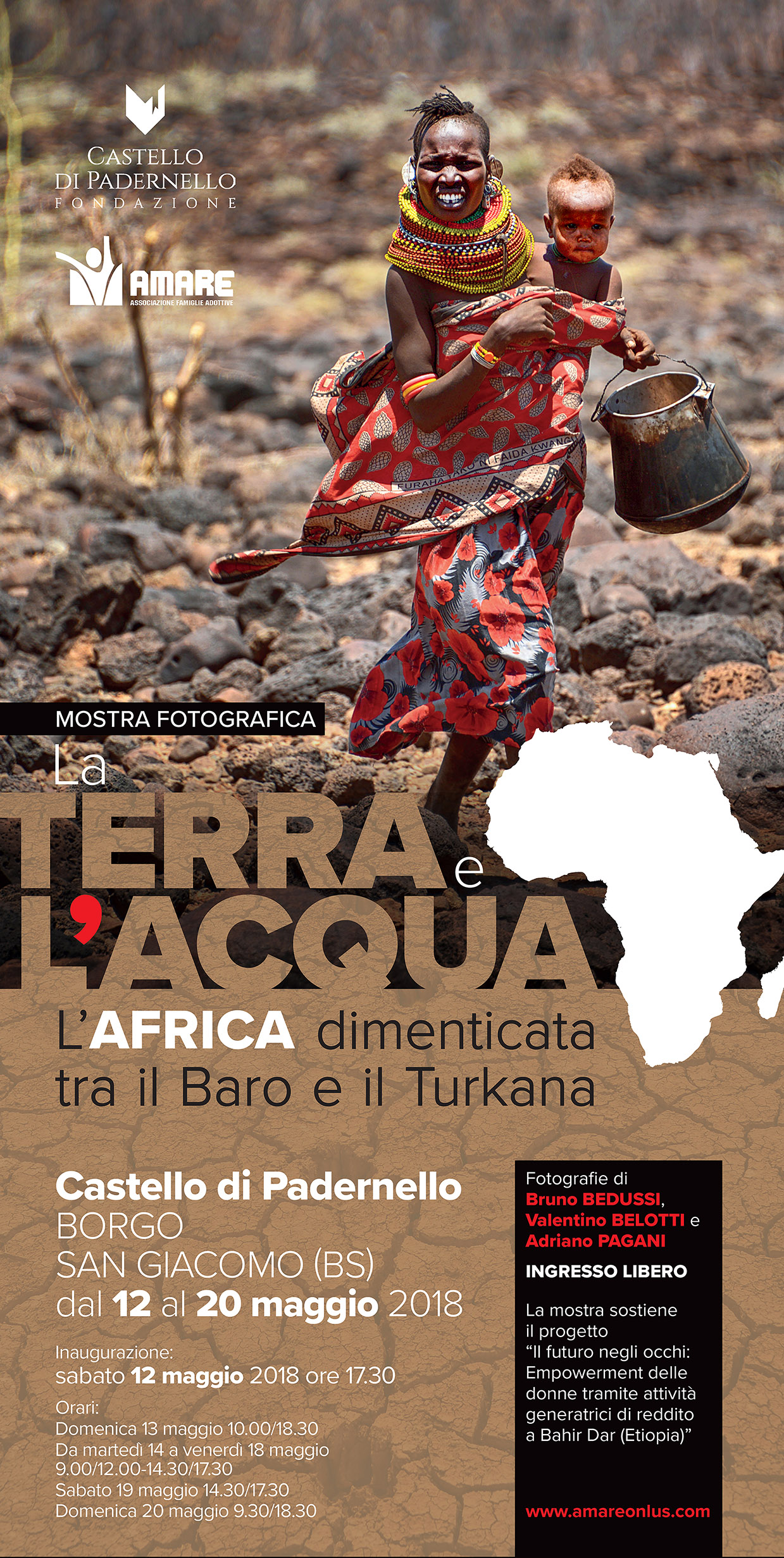 L’Associazione Amare onlus invita la cittadinanza a visitare la mostra fotografica “ La Terra e l’acqua, l’Africa dimenticata tra il baro e il turkana” che sarà allestita al Castello di Padernello di Borgo San Giacomo dal 12 al 20 maggio 2018.