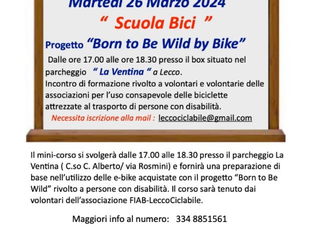 Il minicorso ha lo scopo di far conoscere e fornire i basilari elementi per l'utilizzo delle biciclette inclusive in possesso dei Fiab-LeccoCiclabile aps e la Cooperativa La Vecchia Quercia. L'attività sarà realizzata a Lecco, presso il parcheggio la Ventina, in via Rosmini, dalle ore 17.00 alle...