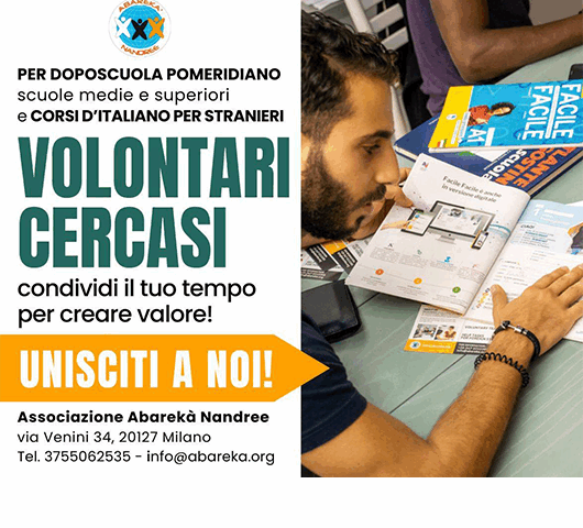 Abarekà Nandree cerca volontari disponibili nel weekend per doposcuola con minori ricongiunti e non accompagnati e corsi di italiano per migranti. Si chiede disponibilità di due ore per il sabato o la domenica per questi progetti. Oltre a insegnanti volontari di italiano, si cercano insegnanti volontari...