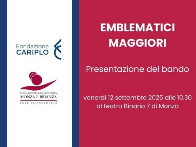 Per la prima volta nel 2026 il bando “Emblematici Maggiori” riguarderà il territorio della provincia di Monza e Brianza: sarà presentato da Fondazione Cariplo e Fondazione della Comunità di Monza e Brianza venerdì 12 settembre alle 10.30 al teatro Binario 7 di Monza (via Turati 8). Il bando rappresenta un’importante...
