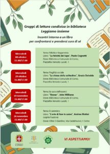 Incontrarsi intorno a un libro per confrontarsi e prendersi cura di sé. La Biblioteca comunale “Paolo Borsellino” di Como, nell’ambito delle proprie attività culturali, ha deciso di organizzare, all’interno della propria programmazione annuale, un ciclo di incontri per la lettura rivolto agli utenti adulti per favorire momenti di confronto a partire da un libro condiviso. Il ciclo di incontri è organizzato in collaborazione con CSV Insubria di Como.