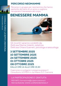Il Consultorio Ucipem Cremona Fondazione ONLUS organizza BENESSERE MAMMA, un percorso di gruppo per neomamme che hanno partorito da meno di un anno e vogliono recuperare il benessere del corpo. Gli incontri si terranno presso il Consultorio Ucipem via Milano 5/c a Cremona. Iscrizioni sul sito www.ucipemcremona.it.