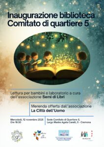 Mercoledì 12 novembre 2025 alle ore 16.30 nella sede del Comitato di quartiere 5, in Largo Madre Agata Carelli 5 a Cremona, si tiene l’inaugurazione della biblioteca di quartiere. In programma ci sono una lettura per bambini e laboratorio a cura dell’associazione Semi di Libri e una merenda offerta dall’associazione La Città dell’Uomo.