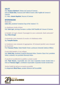 “INSIEME A NOI: RACCONTI: incontro per dialogare sul passato, presente e futuro” è il titolo del convegno che si terrà sabato 23 marzo 2024  alle ore 10,00 (con registrazione partecipanti dalle ore 9,30) presso il Teatro Monteverdi in via Dante 149 in Cremona. Il convegno è organizzato dalla Fondazione “Dopo di Noi: Insieme. ETS” in occasione del ventesimo anniversario della sua costituzione. Per l’iscrizione cliccare sul seguente link: 20 ANNI INSIEME! Incontro del 23 marzo – Fondazione dopo di Noi: INSIEME E.T.S.