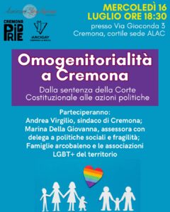 Mercoledì 16 luglio 2025  alle ore 18:30 presso il cortile dell’associazione latino americana di Cremona (ALAC), in via Gioconda 3 (Cremona), Pride Cremona organizza un appuntamento nel quale si parlerà di omogenitorialità e delle azioni politiche intraprese e da intraprendere sul nostro territorio, a seguito della sentenza della Corte Costituzionale che riconosce il diritto alla genitorialità della madre intenzionale nelle coppie omosessuali. Intervengono: