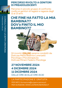 Il Consultorio Ucipem Cremona Fondazione ONLUS organizza l’evento CHE FINE HA FATTO LA MIA BAMBINA? DOVE E’ FINITO IL MIO BAMBINO? PERCORSO ON LINE PER GENITORI DI PREADOLESCENTI.