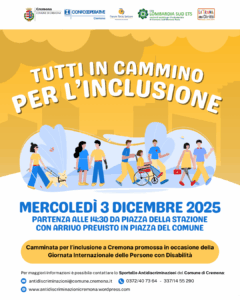 Mercoledì 3 dicembre 2025 a Cremona si terrà la camminata “Tutti in cammino per l’inclusione”, un’iniziativa promossa in occasione della Giornata Internazionale delle Persone con Disabilità.
